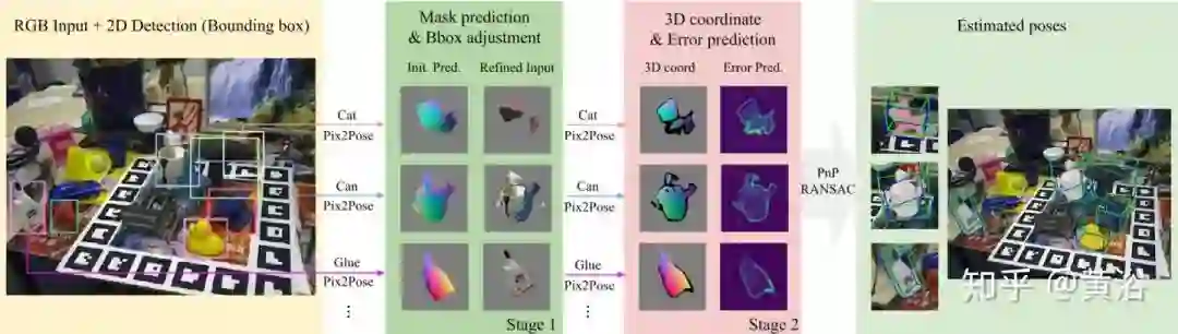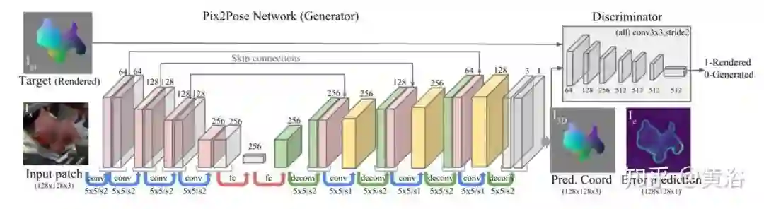 Pix2Pose用目标的裁剪区域预测单个像素的3D坐标。通过恢复被遮挡部分的3D坐标并运用目标区域的所有像素进行姿势预测,建立鲁棒估计。