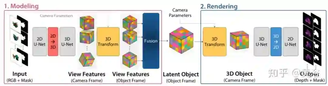 给定一组具有相关联的目标姿态和目标分割掩码的N个参考图像,它试图构建可以用任意相机参数渲染的目标表示。将目标表示为潜在的3D体素网格,可使用标准3D转换直接对其进行操作-自然地可以满足新视图渲染的要求。重建流水线有两个主要组件:1)通过预测每个视图的特征容量并将其融合为单个规范的潜在表示对目标建模;2)将潜在表示渲染为深度和彩色图像。