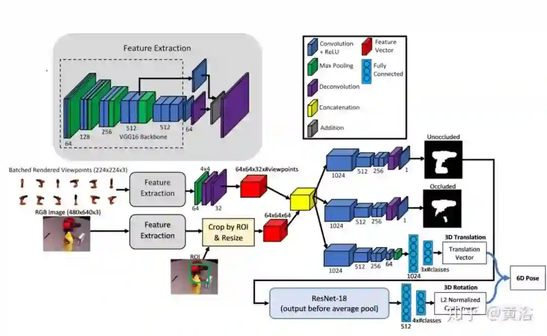 上图可以看出:该方法分两阶段,首先预测目标的中间轮廓表示和遮挡模版,以及描述3D平移的向量,然后从预测的轮廓回归3D朝向的四元数;网络的输入是RGB图像,其中包含针对检测到的目标ROI提议和相关的类别标签。第一个阶段用VGG16为主干,该主干的末尾具有去卷积层,从RGB输入图像生成特征图(与PoseCNN中使用的相同);从输入图像中提取的特征与来自一组渲染目标视点的特征连接在一起,然后通过3个网络分支,其中两个具有相同的结构以预测完整的未遮挡轮廓和遮挡模版;第三分支预测3D矢量,该3D矢量在像素坐标中对目标中心以及来自相机的目标中心的距离编码;网络的第二阶段将预测的轮廓通过两个FCL的ResNet-18架构,输出表示2D朝向的L2归一化四元数。