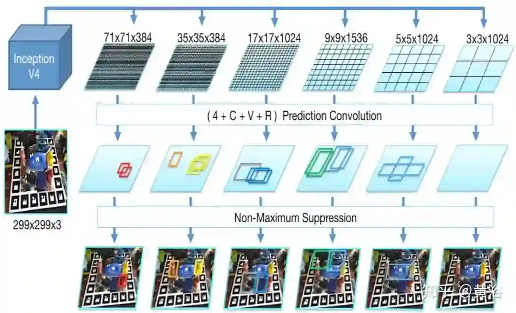 如图是SSD样式的网络预测示意图。为网络提供299×299 RGB图像,并用InceptionV4的分支从输入图像中生成六个比例不同的特征图。然后,将每特征图与经过训练的、形状为(4 + C + V + R)的预测内核进行卷积,以确定目标类别,2D边框以及对可能的视点和平面内旋转的得分,这些得分将被解析以构建6D姿势假设。因此,C表示目标类别的数量,V表示视点的数量,并且R表示平面内旋转类别的数量。其他4个值用于细化离散边框的角点以紧紧适合检测到的目标。