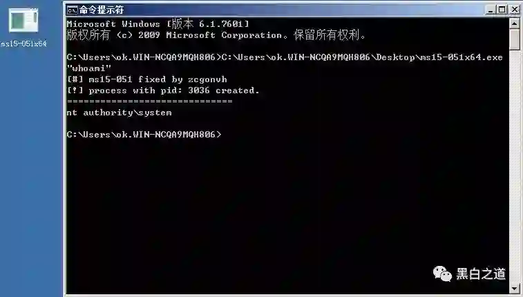 以管理员窗口(cmd)形式打开并执行命令查看一下现在权限whoami发现是system权限说明利用成功了