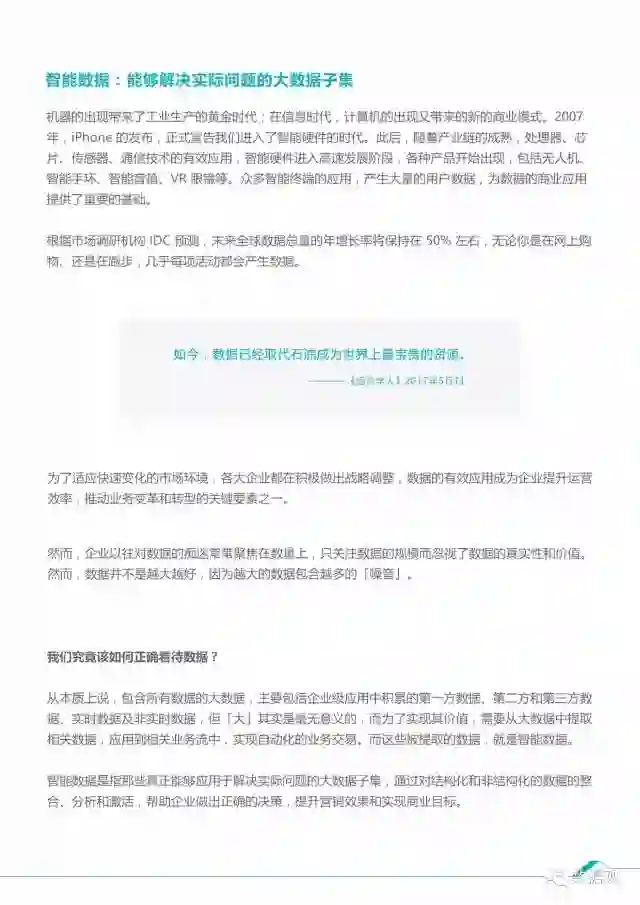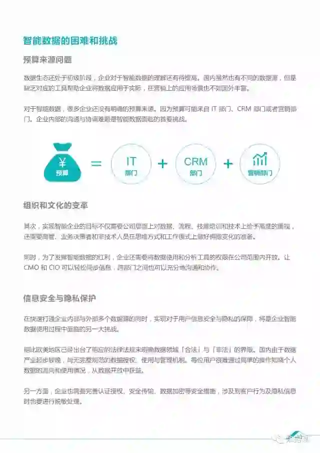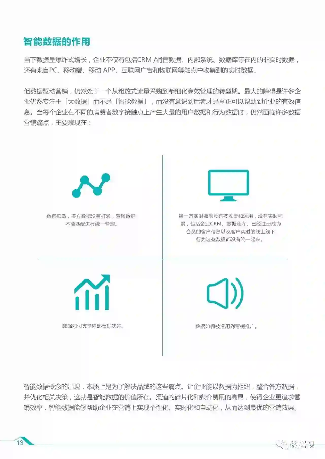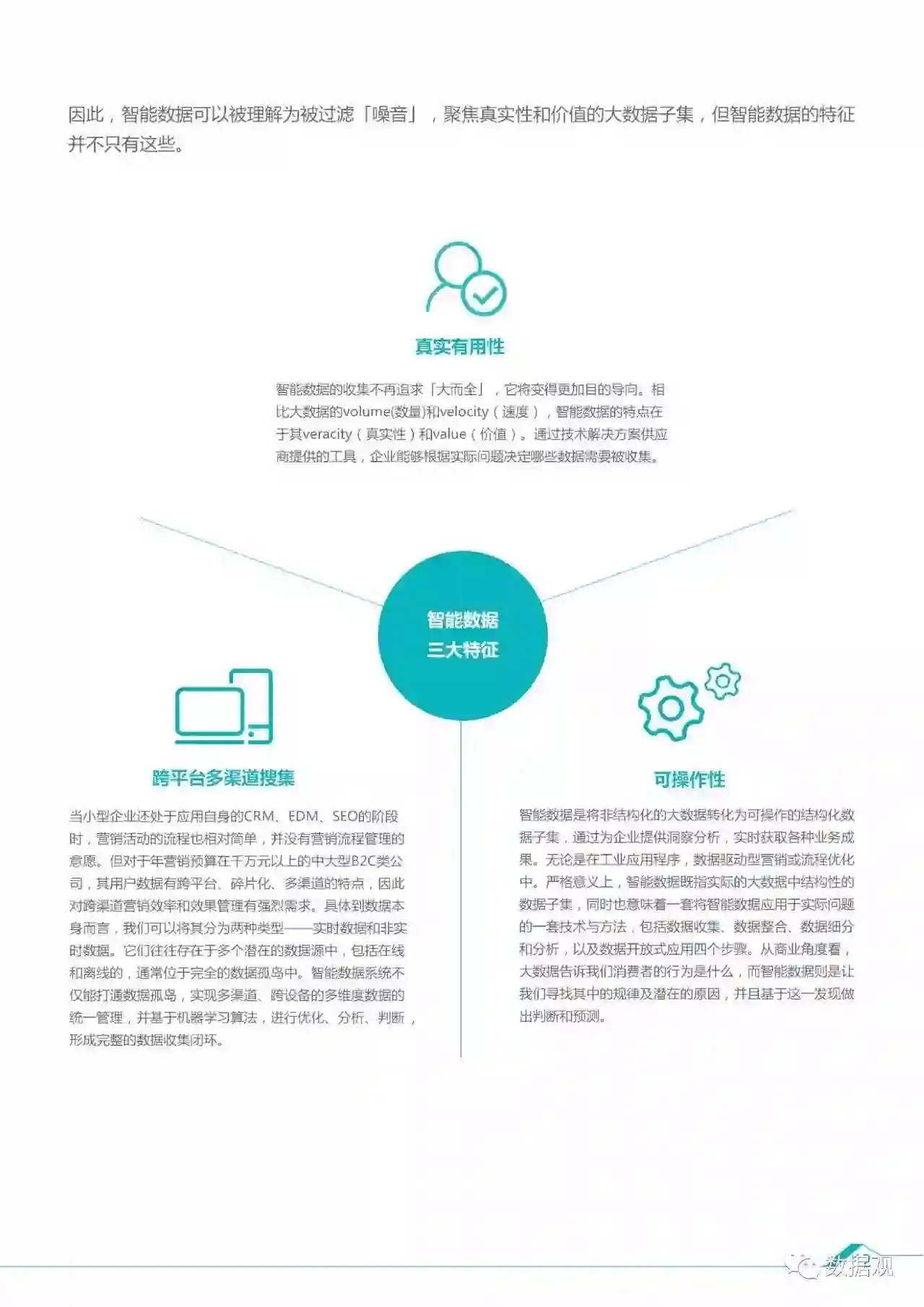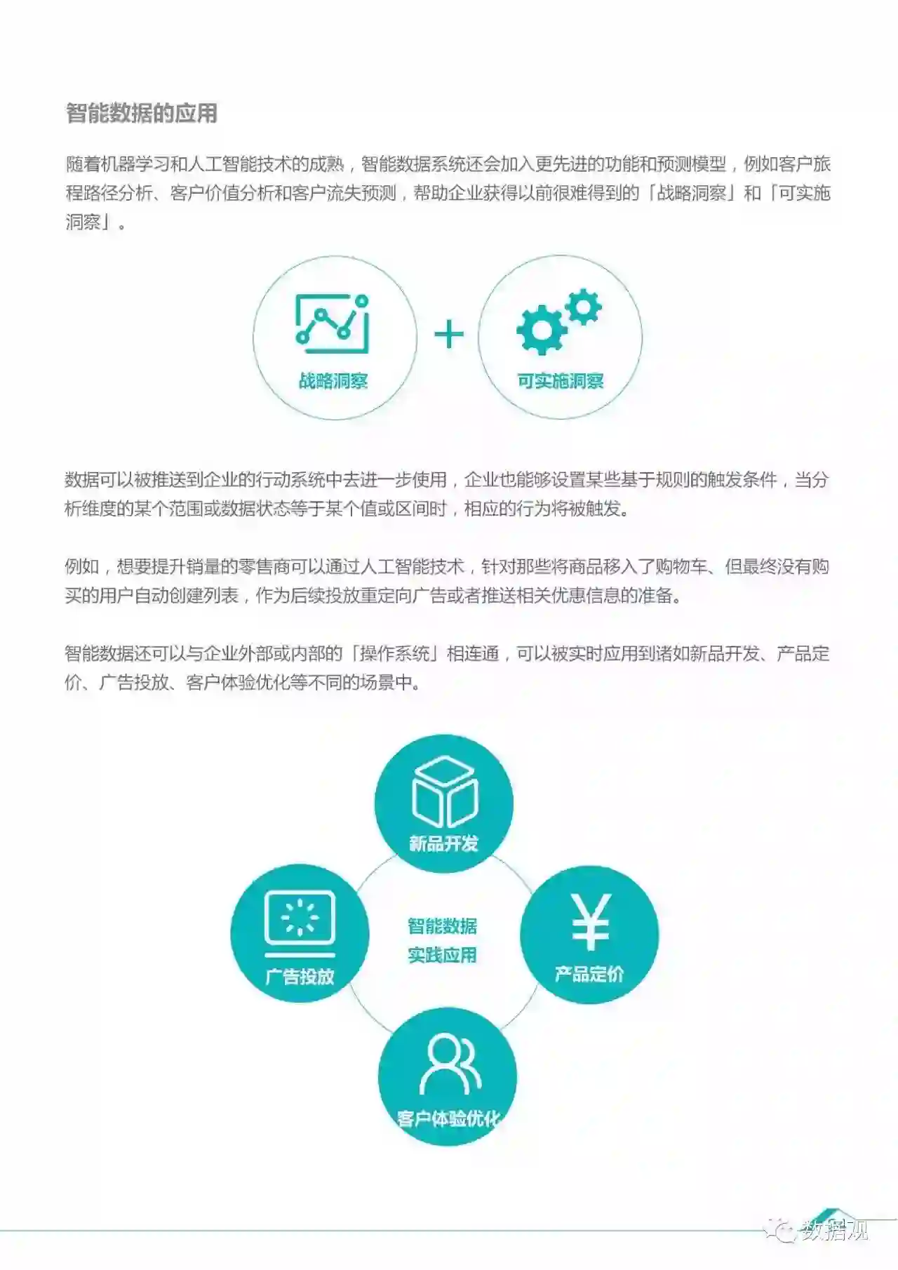 所谓「智能数据」是指那些真正能够应用于解决实际问题的大数据子集。在智能数据的运用上,企业面临的最大难题包括:数据收集、整合与分析以及实现数据应用的闭环。国外像亚马逊、可口可乐、荷兰皇家航空等公司其实已经在对内决策、对外的数据驱动营销以及客户体验的提升和优化上有了较为领先的智能数据实践。