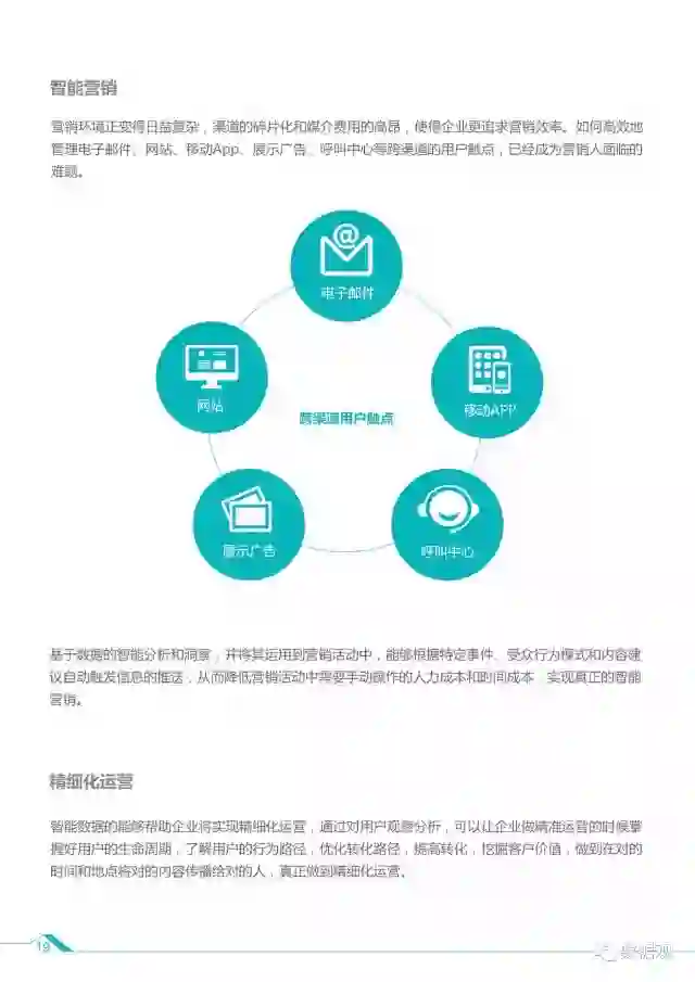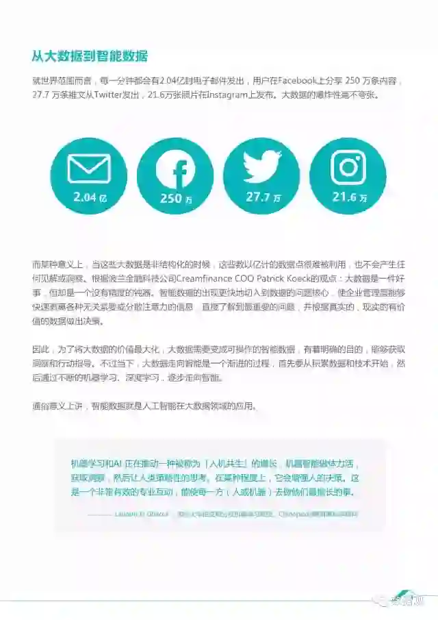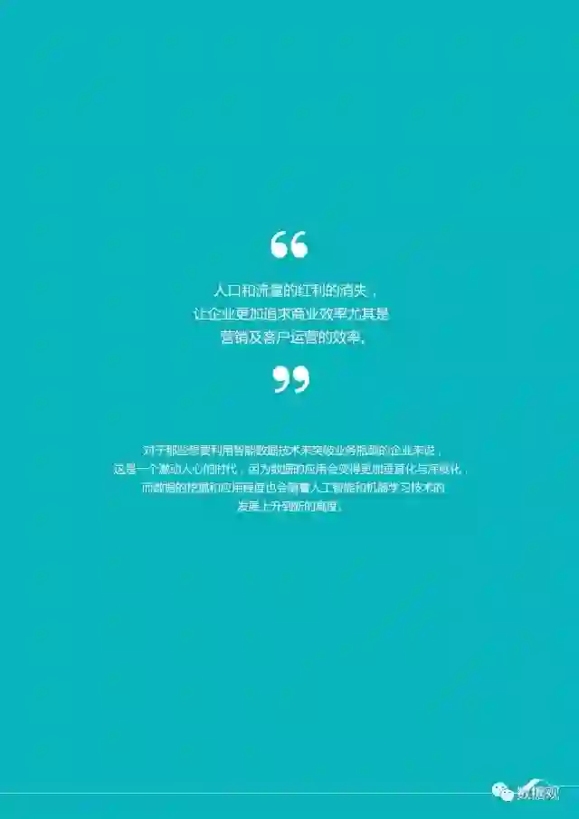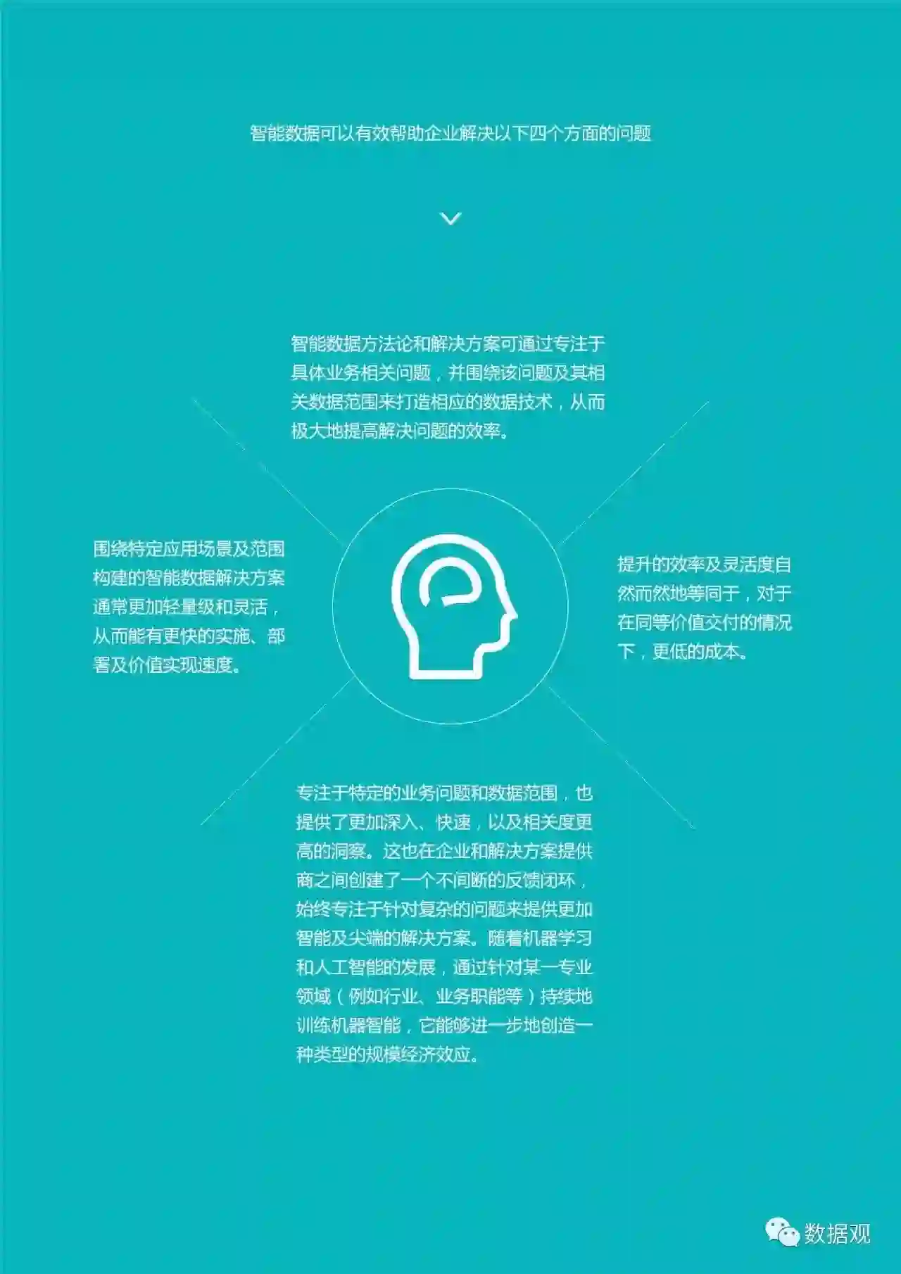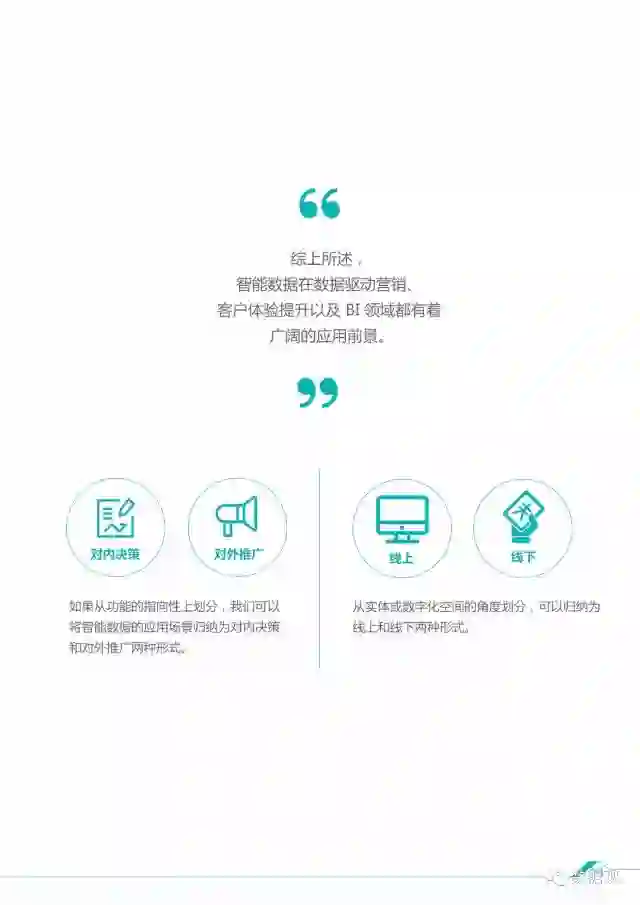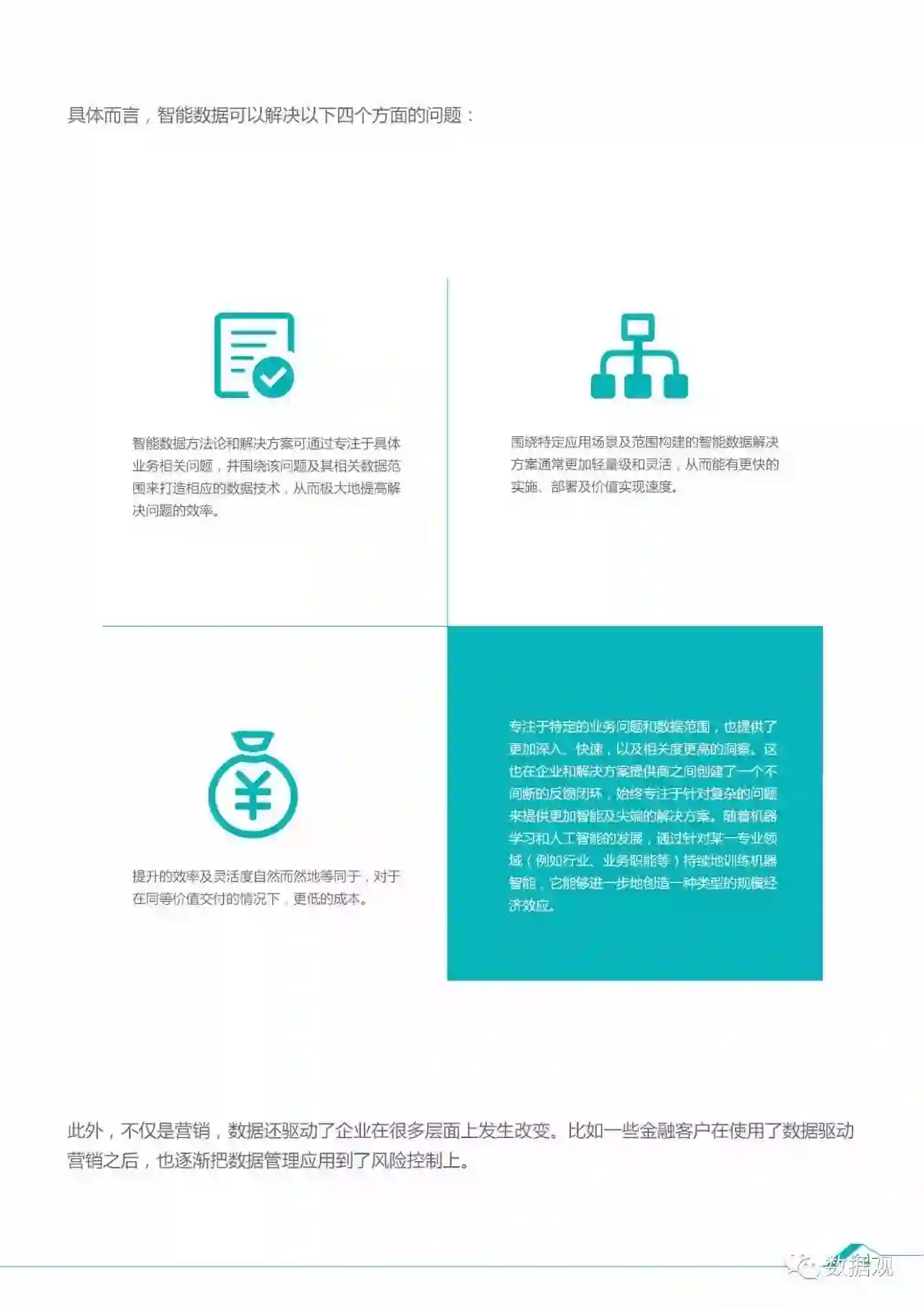 所谓「智能数据」是指那些真正能够应用于解决实际问题的大数据子集。在智能数据的运用上,企业面临的最大难题包括:数据收集、整合与分析以及实现数据应用的闭环。国外像亚马逊、可口可乐、荷兰皇家航空等公司其实已经在对内决策、对外的数据驱动营销以及客户体验的提升和优化上有了较为领先的智能数据实践。