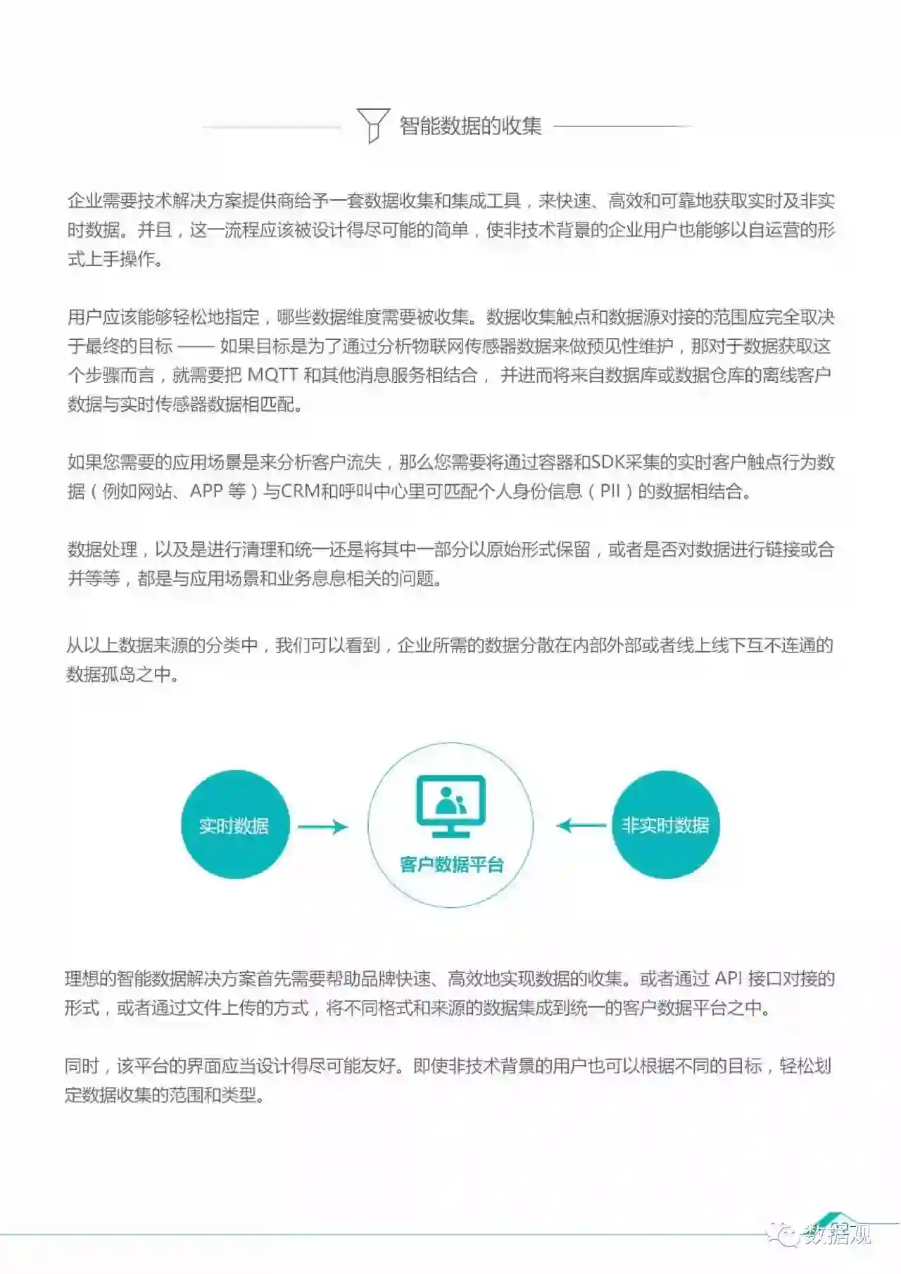 为了让更多企业认识到智能数据的价值与意义,推动智能数据驱动智能企业在国内的发展和应用,知名数字营销媒体 SocialBeta 联合智能数据技术公司 Chinapex 创略发布了《智能数据如何高效驱动营销——智能数据白皮书》(以下简称「白皮书」)。白皮书综述了智能数据的发展、概念和特征,重点梳理了智能数据的应用场景、解决方案,同时也对智能数据的的商业应用——客户数据平台(customer data platform)解决方案的最佳实践案例进行了详细的介绍。