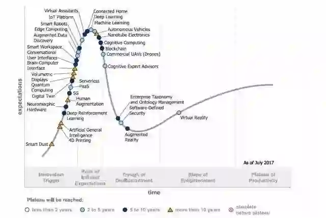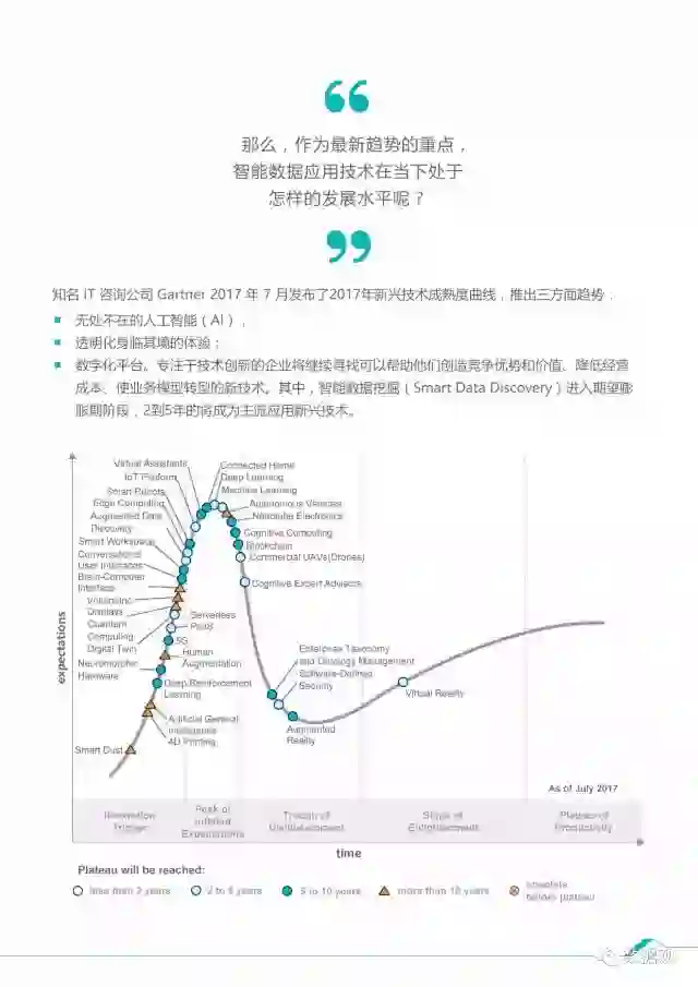 导读:Gartner 7 月发布了2017年新兴技术成熟度曲线,推出三方面趋势:(1)无处不在的人工智能(AI);(2)透明化身临其境的体验;(3)数字化平台。专注于技术创新的企业将继续寻找可以帮助他们创造竞争优势和价值、降低经营成本、使业务模型转型的新技术。其中,智能数据挖掘(Smart Data Discovery)进入期望膨胀期阶段,2到5年的将成为主流应用新兴技术。