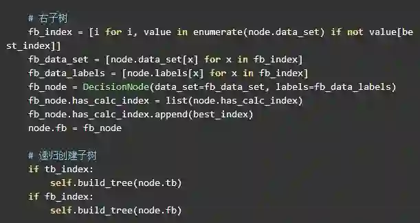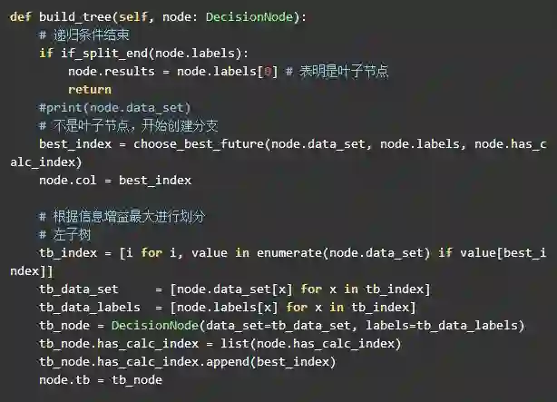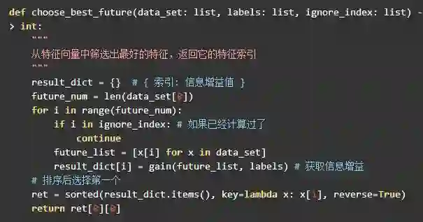 因此计算节点就是调用 best_index = choose_best_future(node.data_set, node.labels, node.has_calc_index) 来获取最佳的信息增益的特征索引。