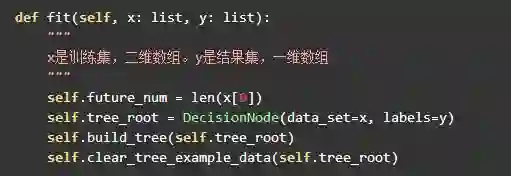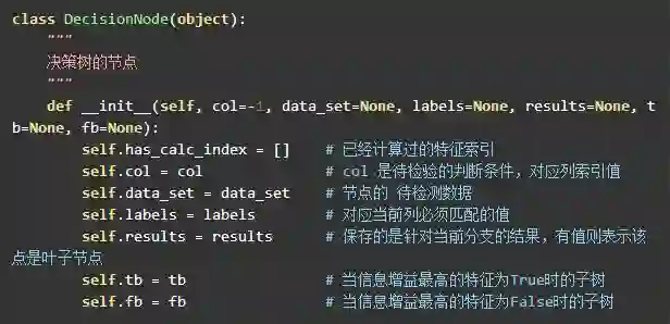 树的节点会有两种状态,叶子节点中 results 属性将保持当前的分类结果。非叶子节点中, col 保存着该节点计算的特征索引,根据这个索引来创建左右子树。