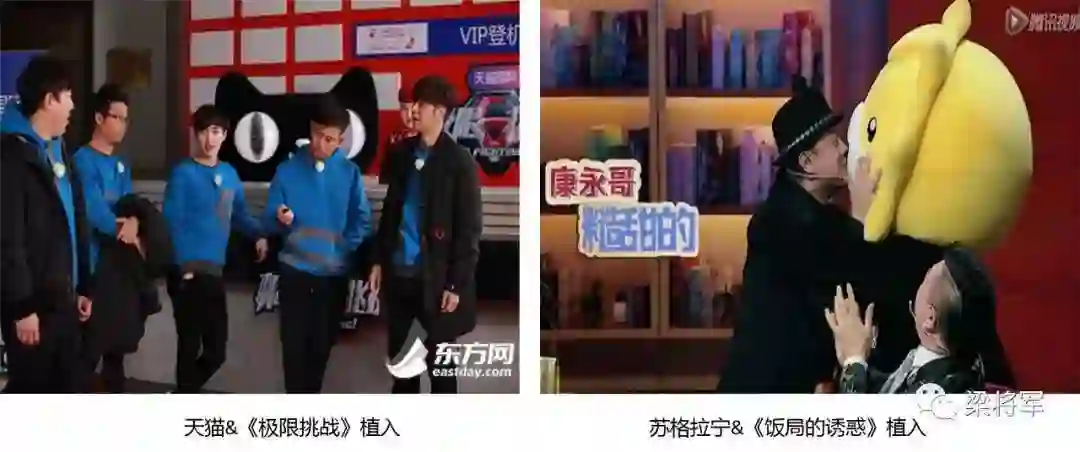 这是天猫和苏宁易购的IP推广。他们通过在《极限挑战》和《饭局的诱惑》做植入,曝光自己的IP角色,塑造IP人设。这是典型的品牌思维在做IP推广,这种方式只能加深用户记忆,却无法带动用户对IP的追捧。