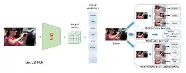 首先,在提取视频特征时,我们提出了Lexical-FCN模型,使用弱监督多实例多标签算法 (Multi-instance Multi-label learning),构建一个从视频的区域序列到单词的弱映射,从而得到一个包含语义信息的视频特征。