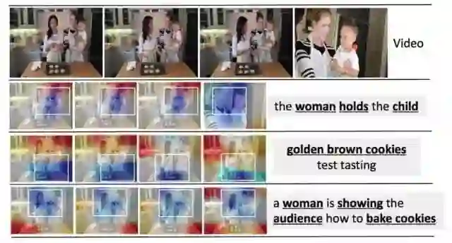 从图3可以看出,虽然训练数据并没有提供每个单词对应视频帧的位置,模型还是可以学习到视频在不同帧中对单词响应最大的区域。