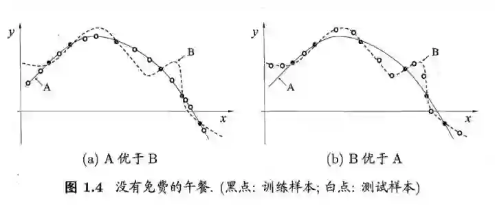 对于训练样本(黑点),不同的算法A/B在不同的测试样本(白点)中有不同的表现,这表示:对于一个学习算法A,若它在某些问题上比学习算法 B更好,则必然存在一些问题,在那里B比A好。