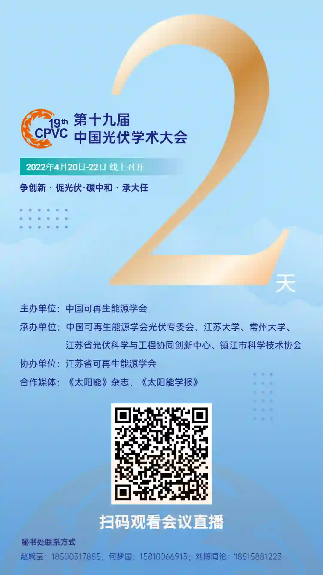第十九届中国光伏学术大会(CPVC19)将于2022年4月20日-4月22日以全线上的形式召开。届时,请各位观众扫描二维码或复制会议直播网址观看会议直播。在此,我们诚挚地邀请太阳能光伏及相关领域内的专家、学者、教师、学生及工程技术人员踊跃参会。