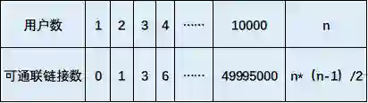 我们把每个用户和另一个用户的关联叫做一条“可通联链接”,那么,一个APP的用户数和可通联链接数的关系如下: