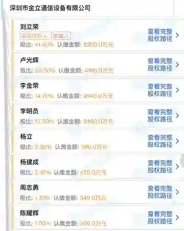 深圳市金立通信设备有限公司部分股东持股情况。来源:启信宝