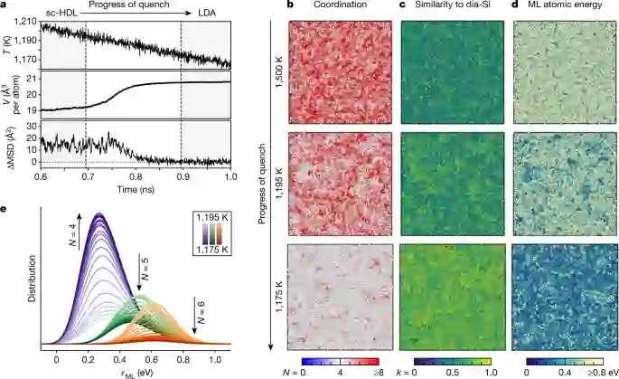研究人员正在开发机器学习方法以精确模拟无序固体和液体的结构和化学键,建模充足数量的原子以便与实验数据进行直接比较。在这篇《Nature》封面论文中,Deringer 等人使用这种方法探索压缩下非晶硅的结构,此时这种元素从半导体态转变为金属态。研究表明,非晶态材料的结构转变比结晶相之间的转变要缓慢得多,且涉及纳米结构域的形成以及任何结晶态中都未发现的局部原子排列。