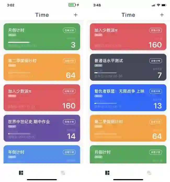 在 Time 中,所有日期被分为「倒计日」和「累计日」,前者用于记录未来某日到今天的天数,后者用于记录过去某日到今天已经多少天了。通过这两个分类,你可以记录每一个对你来说有特殊意义的日子。同时,在每个日子中,你还可以为它们添加备注,记录更多东西。