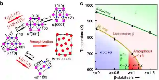 前者导致b相转变为a¢/a²马氏体,后者导致晶面{222}b部分移位形成w相。而对于特定成分的b钛合金,马氏体相变过程中的局域晶格切变和畸变使得结构无序的非晶相相对于晶态a¢/a²/w相更容易形成,导致马氏体非晶化的出现(如图)。这种非晶相可被称为“非晶马氏体”。这一发现丰富了固态非晶化机制和马氏体相变理论。