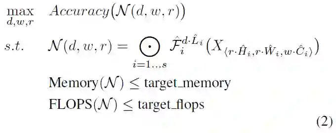 对于一个神经网络,作者假定所有的层都必须通过相同的常数比例进行统一的扩展。因此,模型扩展问题的可以表示为(公式(2)):