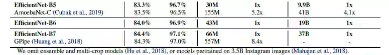 随后,作者在 ImageNet 数据库上对 EfficientNet 进行了训练。实验结果表明 EfficientNet 模型在参数量和 FLOPS 方面比其他卷积网络少一个数量级却能得到近似的准确率。特别是 Efficient-B7 在 top1 达到了 84.4% 在 top5 达到了 97.1%,比 GPipe 更加准确但模型小了 8.4 倍: