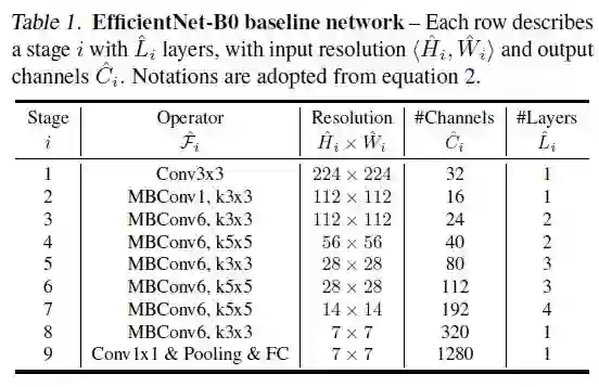 表 1:EfficientNet-B0 网络,每一行表示多层网络的某个阶段,resolution 输入张量大小,Channels 表示输出通道数。表中的符号与公式(1)中的符号意思