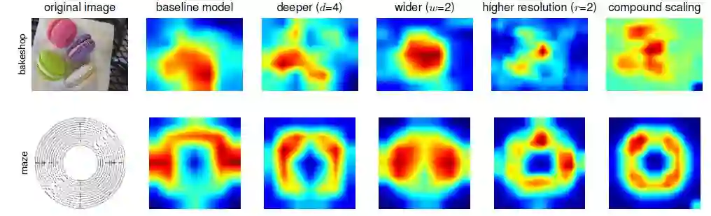 为了更深入地理解复合扩展法能取得更好效果的原因,作者对网络的激活图进行了可视化。比较了相同配置的基线网络经过不同的扩展方法后激活图的变化: