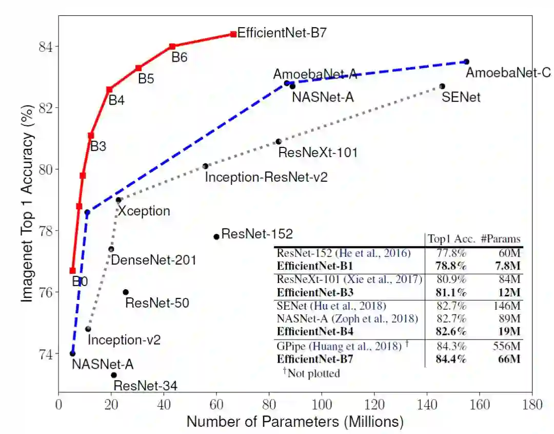 模型扩展被广泛地用于提高卷积网络的准确性。例如,ResNet 系列可以通过增加层数从 ResNet-18 扩展到 ResNet-200。谷歌的开源神经网络训练库 GPipe 通过对基线网络的四倍扩展可以在 ImageNet 数据库上达到 84.3% 的 top-1 精度。然而,虽然有很多途径对卷积网络进行扩展,却鲜有工作对其进行深入的理解。许多先前的工作都是针对神经网络三个维度——深度、宽度和图像大小中的一个因素进行调整。虽然对其中任意两个或三个因素进行调整看起来是可行的,但实际上这需要大量的人工调参来达到勉强说的过去的提升。对于 EfficientNet 的效果,我们先来看张图: