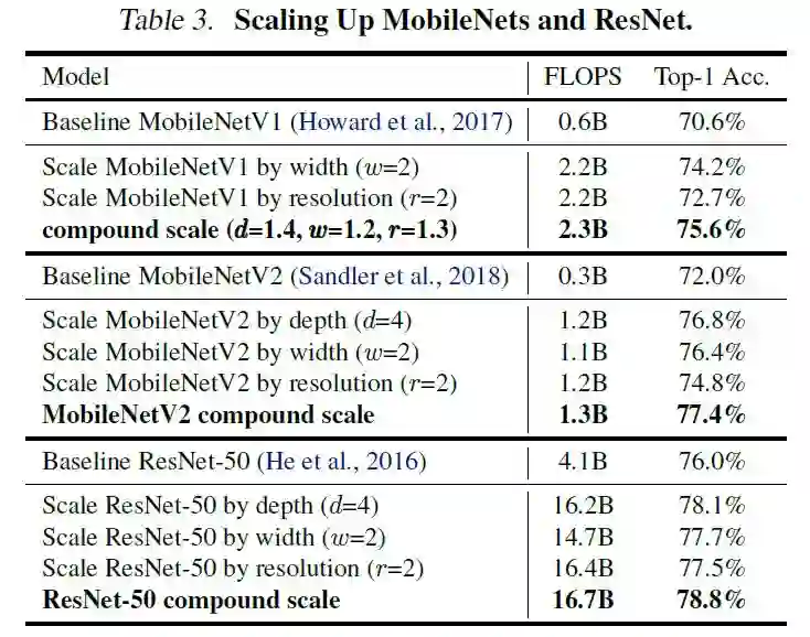 实验这一部分,作者首先对在广泛使用的 MobileNets 以及 ResNets 上对他们提出的模型扩展法进行了验证。其实验结果如表三所示: