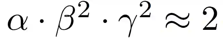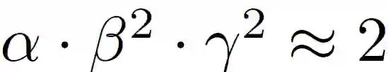 其中α,β,γ是常数,它们有小型网络搜索确定。Φ则是一个由用户指定的扩展系数,它用来控制到底有多少资源是模型扩展可用的。对于一般的卷积操作,其 FLOPS 需求与 d,w^2,r^2 是成比例的。由于卷积网络中最消耗计算资源的通常是卷积操作,因此使用公式(3)对网络进行扩展会导致总 FLOPS 近似变为。本文中作者使用公式