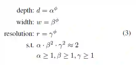 其中 w,d,r 分别是扩展网络的宽度、深度和分辨率。 是基线网络中预定义的网络参数。