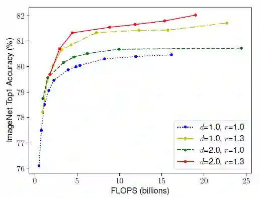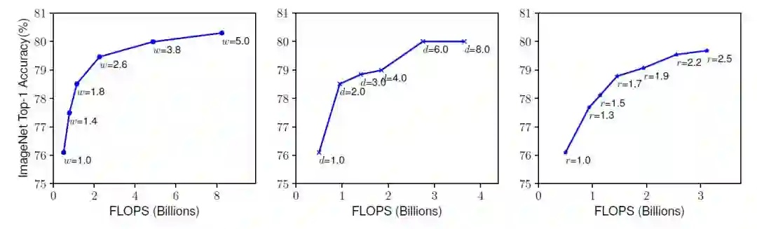 解决公式(2)的一个难点就在于 d,w,r 彼此依赖,并且会由于不同的资源条件所改变。传统方法主要集中于独立地解决其中一个维度的扩展问题。下图是改变每个维度对模型性能影响的部分实验结果: