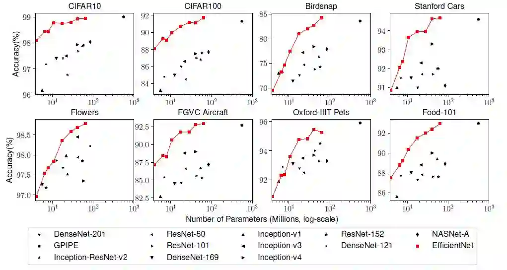 同时,作者也在常用的迁移学习数据集上对 EfficientNet 进行了评估。EfficientNet 的性能较其他类型的网络均有一致的提升。实验结果如下图所示:
