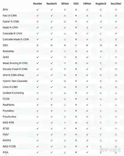 截至 2020 年 5 月底,MMDetection 官方模型库已经支持了35篇论文中的算法,提供了超过 250 个预训练模型,是目标检测领域最大规模的模型库。除此之外,还有 16 篇论文在 Github 上开源了基于 MMDetection 的代码。目前官方支持的方法如图所示: