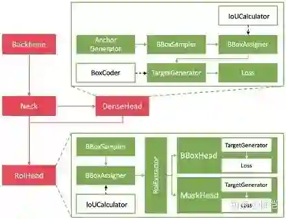从设计上看,MMDetection V2.0 的模块化设计比之前的版本更加细粒度,使得更多的模块可以被更灵活地替换或调整,让 MMDetection 从单纯的目标检测框架向检测类任务的框架平台转变。新的模块设计如下图所示。