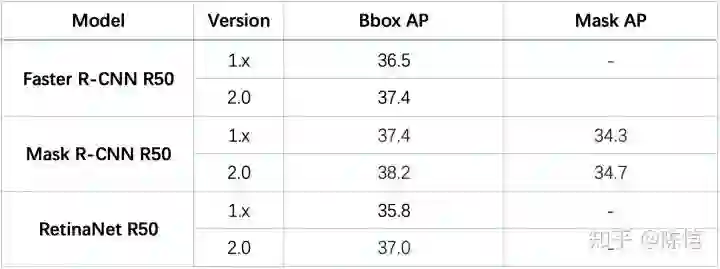 **MMDetection V2.0 的基准模型精度相比于 V1.x 有了显著的提升。**我们虽然在 V1.0 的技术报告中对各种参数做了 ablation study,但是代码库中的默认配置选用了最朴实无华的版本。在 V2.0 中,在不增加训练和测试代价的前提下,通过对默认超参的调节和实现的优化,例如使用 L1 Loss 而非 SmoothL1 Loss 等,获得了不小的精度提升。Detectron2 在这方面也有不少可圈可点的地方,和 MMDetection V2.0 的主要区别在于默认采用了 multi-scale 训练,而我们仍然选择以 single-scale 作为默认配置。不过在采用相同参数的情况下,精度几乎一致。