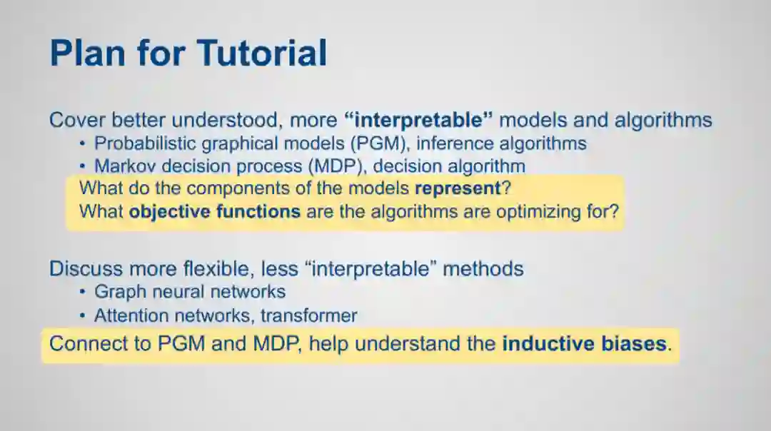 本教程介绍了概率图模型常用的近似推理算法和马尔科夫决策过程的值迭代算法,重点是了解算法优化的目标。然后我们考虑更灵活但更难以解释的信息传递算法,包括图神经网络和注意力网络。我们讨论了这些更灵活的网络如何模拟更易于解释的算法,通过算法对齐提供了对这些网络的归纳偏差的一些理解,并允许将这种理解用于网络设计。