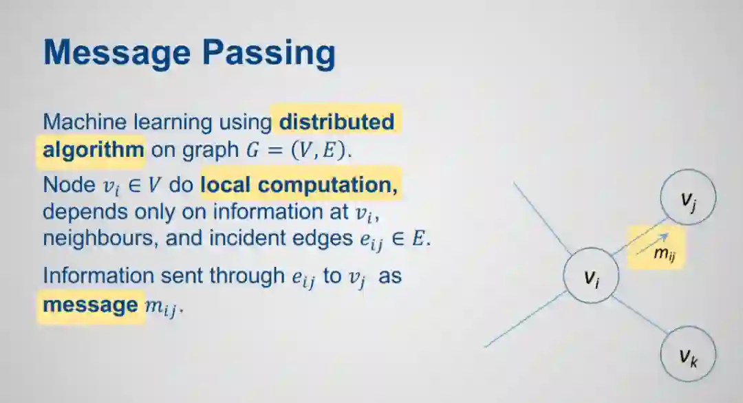 消息传递算法是在图上操作的分布式算法,其中每个节点只使用本地存在于节点和事件边缘的信息,并且只将信息发送给其邻近节点。它们通常在机器学习中非常有效,而且相对容易并行化。例子包括概率图形模型的近似推理算法,马尔科夫决策过程的值迭代算法,图神经网络和注意力网络。