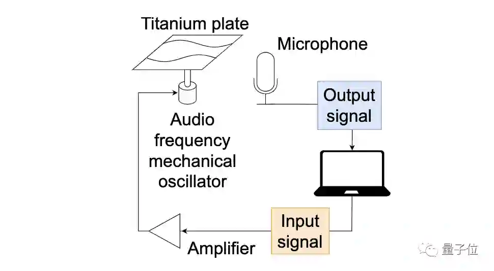 来自计算机的接收控制信号以及金属板震荡产生输入信号,再把信号输出到扬声器上,由此制造了一个反馈闭环。