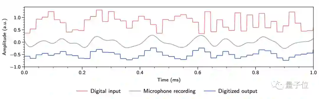 在声学神经网络系统中,振荡板接收由MNIST图像改造的声音输入样本(红),在驱动振动板后,信号由麦克风记录(灰),并及时数模转换为输出信号(蓝)。
