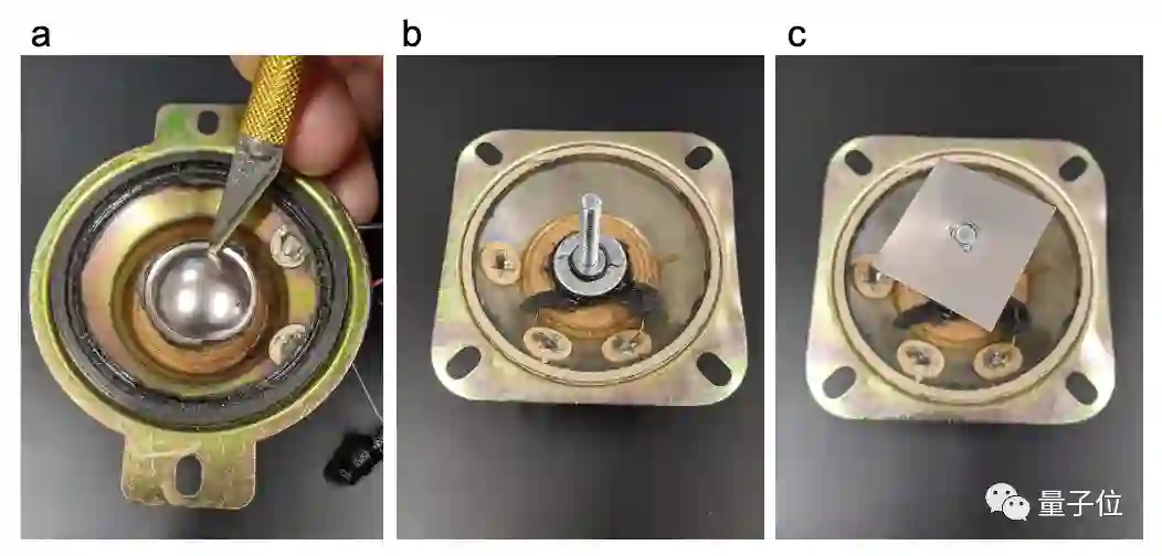 两位做实验的博士后拆掉了扬声器上方的振膜,将方形的钛金属板和喇叭动圈相连。