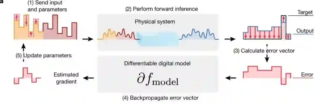 整个物理系统的流程如下图:先将数字信号转换为模拟信号,输入进物理系统中,然后将输出与真实结果对比,经过反向传播后,调整物理系统的参数。
