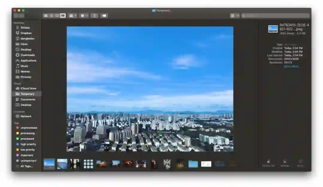 作为系统级的文件管理器,访达经常被用户诟病不够好用,而本次的更新也对访达做出了一些优化。首先,之前针对 iTunes 设计的 Cover Flow 视图改成了全新的画廊显示。虽然在这个视图模式下,访达依旧只能聚焦一张图片,但是该文件夹中的所有文件都会以缩略图(Thumbnails)的形式出现在大图的下方,与此同时,在访达界面的右侧边栏会显示聚焦图片的简单信息和快速操作按钮。