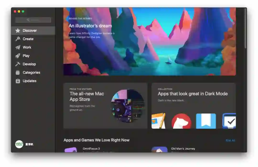 一直不受重视的 Mac App Store 在 Mojave 也得到了全新改版,整体上更接近于 iOS 上 App Store 的风格,采用了侧边栏的设计,标签页的分类也与之前的不同,现在改为了发现、创作、工作、开发、更新等,而已购按钮被隐藏到了用户信息内。