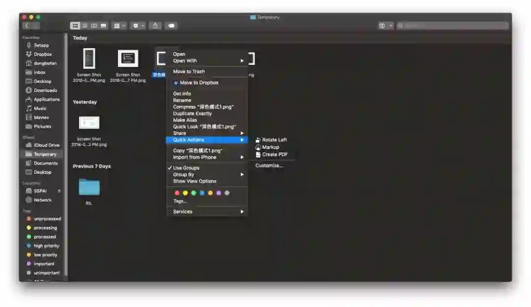 最后,访达里的快速预览功能也得到了加强。在之前的 macOS 版本中,我们可以通过选中文件后敲击空格键来快速预览文件内容,包括图片、PDF、Text 等格式,但是无法进行更多的操作。而在 Mojave 中,我们可以在快速预览状态下直接对预览内容进行一些简单的操作,比如说你可以在预览图片时进行标注或者旋转,而不用再像之前那样双击打开图片后再进行这些操作了。值得注意的是,你在快速预览时进行的操作会被实时保存到原文件中。