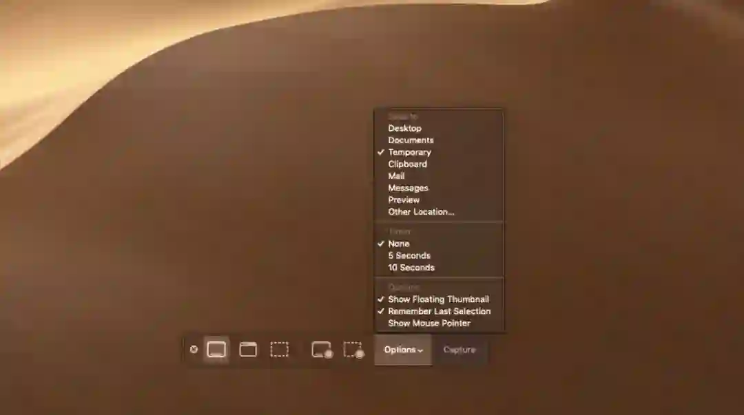 习惯使用 macOS 自带截图功能的朋友应该都知道,我们可以使用 ⇧Shift-⌘Command-3、⇧Shift-⌘Command-4 和 ⇧Shift-⌘Command-4-space 等快捷键来制作不同类型的截图,还可以在使用这些快捷键的同时按住 ⌃Control 键来将所有截图直接添加到剪贴板。如果你记不住这些快捷键或者嫌麻烦,现在你可以在 Mojave 中使用一个快捷键来获取所有的功能。点击快捷键 ⇧Shift-⌘Command-5,会出现一个全新的截图窗口,你可以直接在工具栏上选择全屏截图、区域截图、窗口截图、全屏录制或者区域录制,也可以直接修改保存路径、倒计时等其他设置。