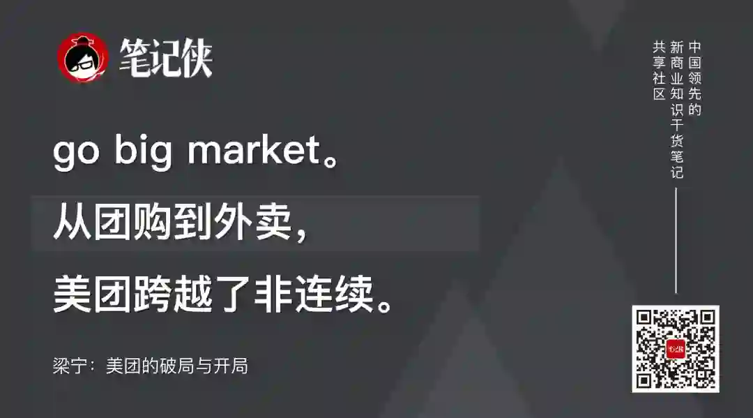 所以,go big market。从团购到外卖,美团跨越了非连续。