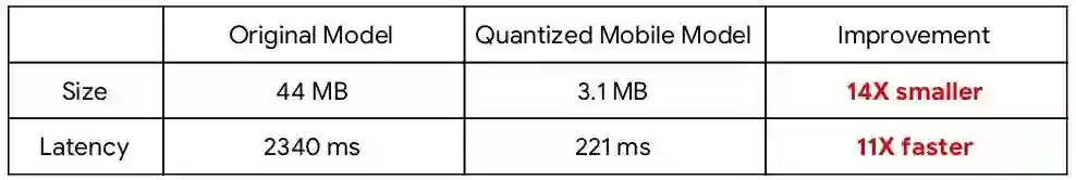 敲定模型架构后,我们使用 TensorFlow 模型优化工具包,通过量化来进一步缩小移动模型。量化是适用于大多数 TensorFlow 模型移动部署的一项重要技术,在本例中,它可将模型大小缩小为原来的 1/4,在大幅加速模型推理的同时,对质量的影响很小。