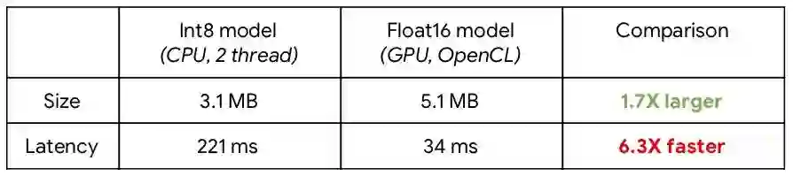 为了在 CPU 和 GPU 上都能达到最佳性能,我们创建了针对每种芯片进行了优化的两组 TensorFlow Lite 模型。我们用 int8 量化模型进行 CPU 推理,用 float16 量化模型进行 GPU 推理。GPU 通常能比 CPU 达到更好的性能,但 GPU 目前仅支持浮点模型,获得的模型 size 比经 int8 量化的模型稍大。以下是 int8 和 float16 模型的表现: