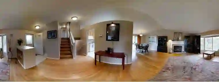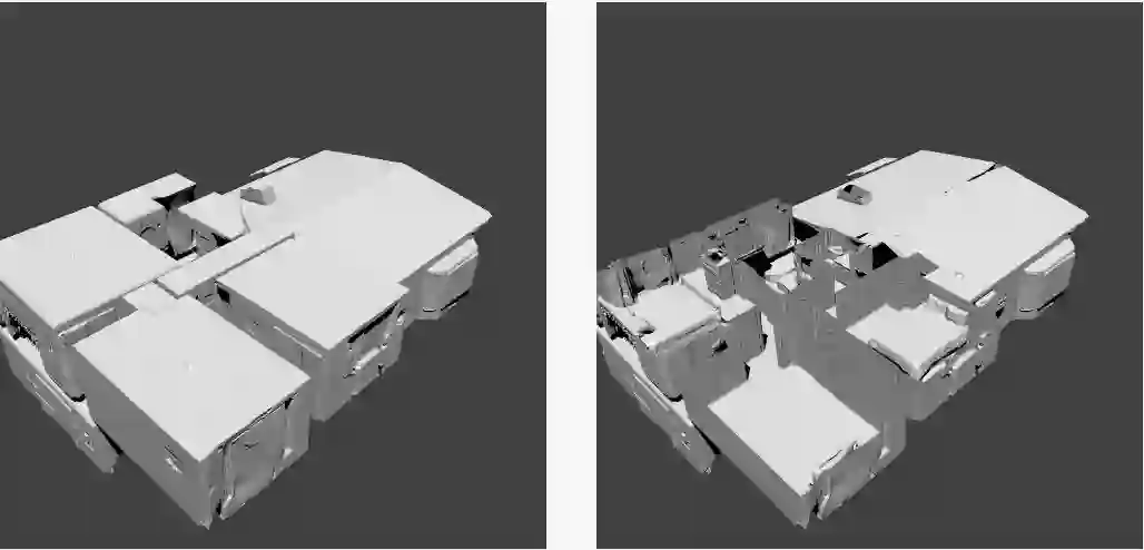 不同于常见 3D 模型材质渲染的方法,我们对于不同的视点选取材质的方法是自适应的(更近的视点采样更多)。受扫描位置稀疏性、设备、重建算法、伪像等因素的限制,植被和小物体等细节大多数时候都无法正确重建。反射表面,例如窗户和台面,将在重建的网格上留下孔。这些都导致了渲染输出的不完整。
