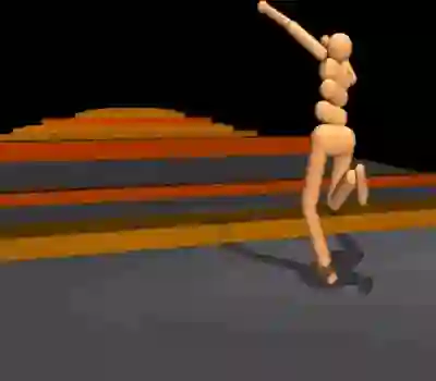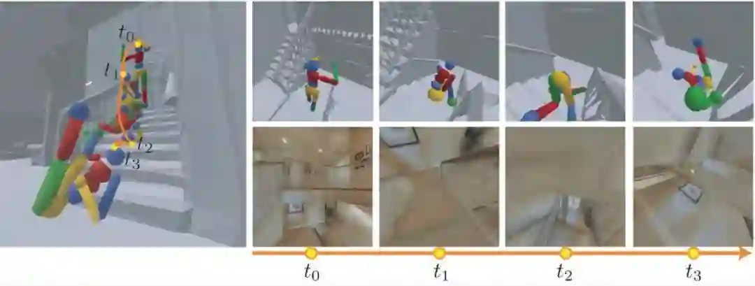 下图展示了火柴人从楼梯跌落时的场景,上行的火柴人动作轨迹看上去很符合物理定律,下行是对应的火柴人视角的观察。