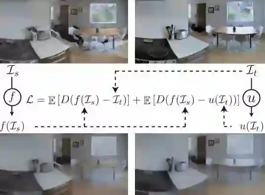 我们项目的另一个创新是把像素级域适应 (pixel level domain adaptation) 的机制嵌入到渲染引擎当中。对于渲染图像 I_s 和真实图像 I_t,我们的后处理网络 f 可以让渲染图像看起来像真实世界中的照片,即 f(I_s)≈I_t。与此同时,我们还训练了另外一个网络 u,让真实世界中的照片看上去像我们的渲染图像,即 u(I_t)≈f(I_s)(此处「≈」仅非严谨地代表「相似」)。